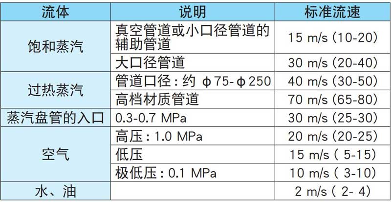對管道和設(shè)備的成本核算越有利。而且管道口徑增大還會(huì)導(dǎo)致熱量損失增大。因此,在選擇管道口徑時(shí),應(yīng)根據(jù)使用情況確定允許的壓力損失,在保證實(shí)際壓力損失不超過所確定范圍的前提下選擇最小管道口徑。但是過高的流速會(huì)加速管道磨損,并且可能會(huì)引起振動(dòng)。通常情況下,根據(jù)使用情況并基于流體的類型和特性及管道口徑來設(shè)定流體的標(biāo)準(zhǔn)流速。